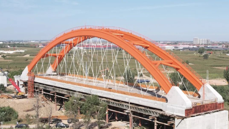 近日,跨捷地堿河特大橋主體鋼構順利完工。跨捷地堿河特大橋全長131米,為下承式有砟軌道雙線簡支拱高速鐵路橋,主要承重結構為提籃式鋼管拱肋及尼爾森吊桿體系,拱肋用七百余噸重型鋼結構件及所有吊桿用鋼纜,均由巨力索具股份有限公司制造,安裝。