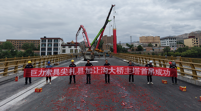 6月20日,加讓溝大橋主塔首吊作業(yè)取得圓滿成功,巨力索具股份有限公司承建了該項目的所有上部懸索結(jié)構(gòu),包括基座及主塔鋼結(jié)構(gòu),索鞍和索夾鋼結(jié)構(gòu),懸索橋主纜,吊桿用鋼拉桿及錨固鋼拉桿。