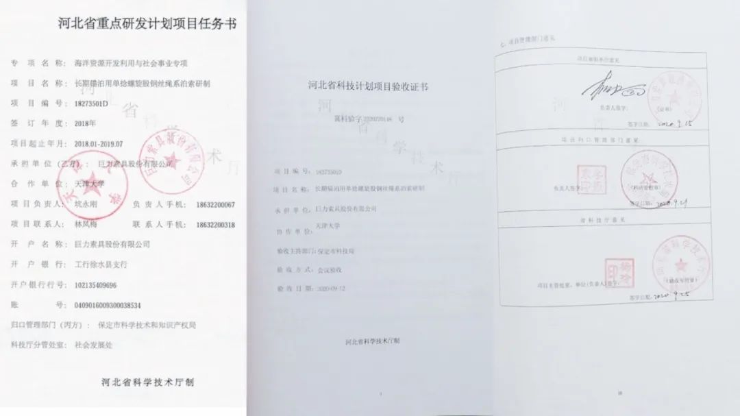 2020年9月12日,巨力索具“長期錨泊用單捻螺旋股鋼絲繩繩系泊索研制”通過了河北省科技廳組織的驗收,項目完成了長期錨泊系泊索索體、閉式澆鑄接頭、彎曲限制器的產品研發,形成了系泊索集成設計,集成配套的能力。