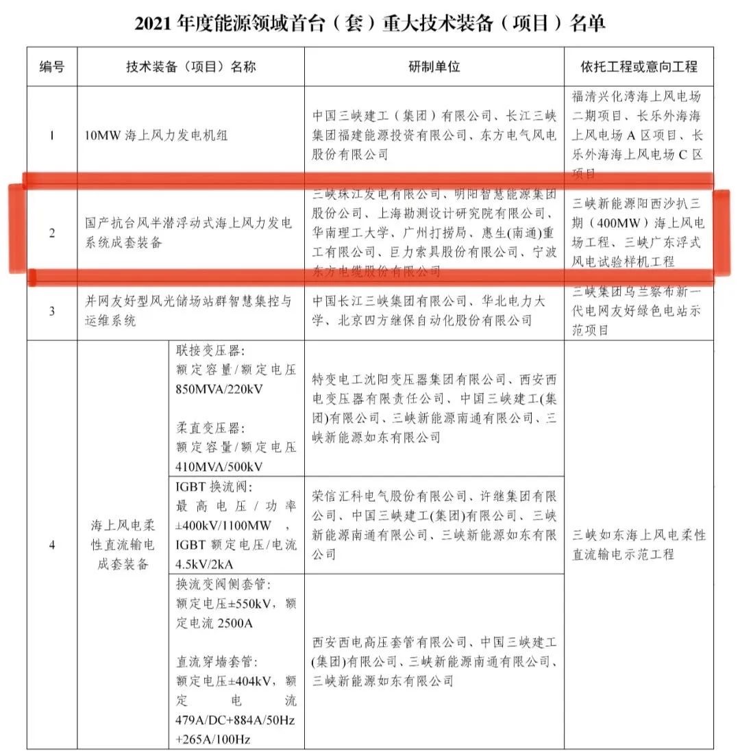 2022年5月13日,國家能源局把巨力索具參與研制的國產抗臺風半潛浮動式海上風力發電系統成套裝備列入國家首臺(套)重大技術裝備(項目)名單。