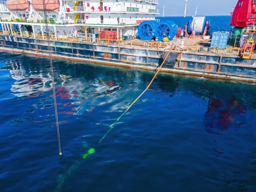 2021年6月7日,海上漂浮式風機永久系泊索在廣東陽江項目場完成水下鋪設,為后續海上風機浮式基礎平臺到達安裝打下堅實基礎。